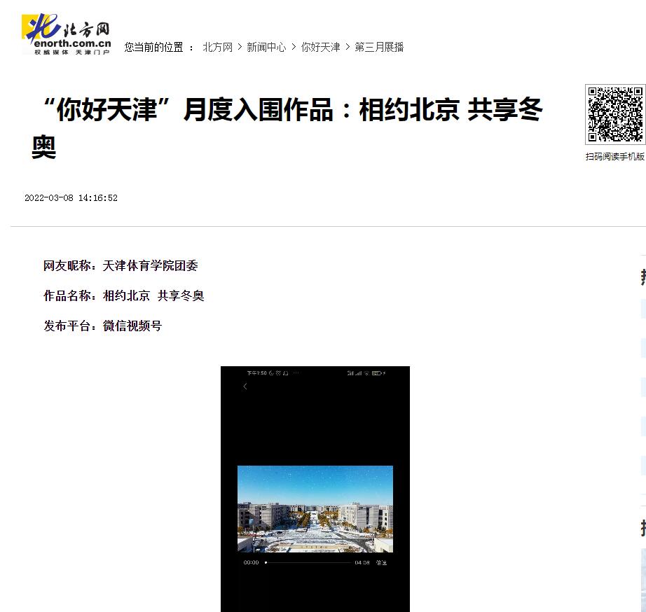 日前,经抖音、快手、微信视频号、新浪微博、津抖云五个平台按照“网络热度”的推荐,由评委会进行评分,“你好,天津”网络短视频大赛最终确定210个作品入围第三个月赛。申博团委微信视频号参赛作品《相约北京、共享冬奥》入围。