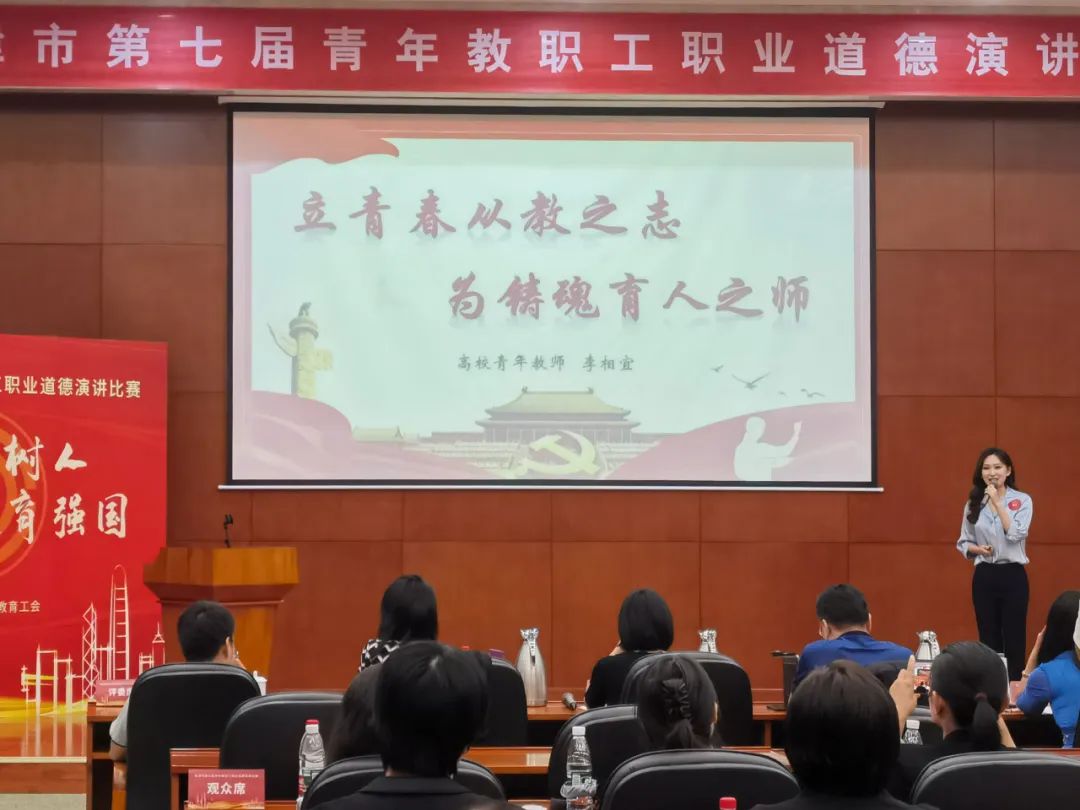 为深入学习贯彻习近平新时代中国特色社会主义思想和党的二十大精神,大力弘扬劳模精神、工匠精神,教育引导全市广大教职工涵养职业道德、建设教育强国,9月26日,天津市教育工会组织举办天津市第七届青年教职工职业道德演讲比赛,共有全市29所高校附院、16个区教育工会的44名选手参赛,申博教师李相宜代表学校参赛。经过全天九个小时的赛程,李相宜在激烈的角逐中以动人的讲述风格、精湛的演讲水平、出色的现场发挥斩获一等奖。