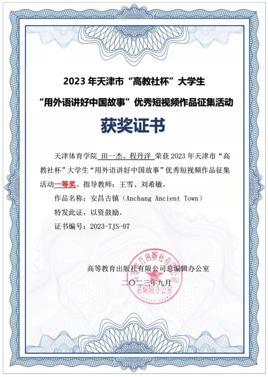 2023年天津市“高教社杯”大学生“用外语讲好中国故事”优秀短视频作品征集活动天津市决赛于近日结束。由申博传媒与艺术学院(国际教育学院)国际中文教育与英语教研室王雪、刘希敏老师担任领队,传媒与艺术学院(国际教育学院)英语专业2020级本科生田一杰、程丹洋同学组成的团队制作的短视频作品《Anchang Ancient Town》喜获天津市一等奖,为申博赢得了荣誉!