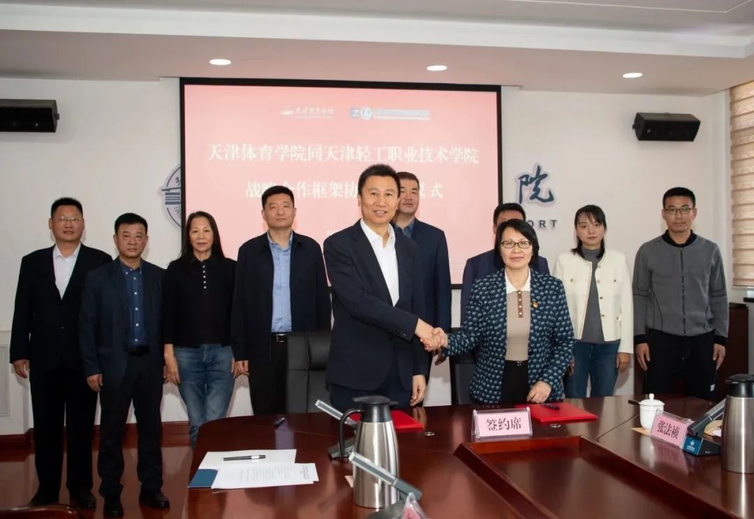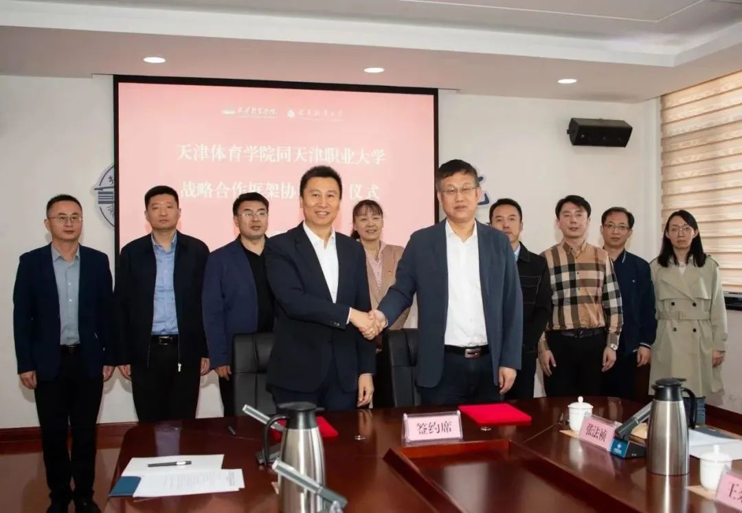 2023年10月27日,申博官网同天津职业大学、天津轻工职业技术学院、天津体育职业学院战略合作框架协议签订仪式在申博举行。天津市教育委员会发展规划处副处长李清,天津市体育局宣教法规处副处长王笛,天津职业大学党委副书记、校长郑清春,天津轻工职业技术学院党委副书记、院长李云梅,天津体育职业学院党委副书记、院长王伟,申博官网党委副书记、院长张欣,以及四所院校的相关职能处室领导出席了会议。会议由申博官网副院长杨智主持。