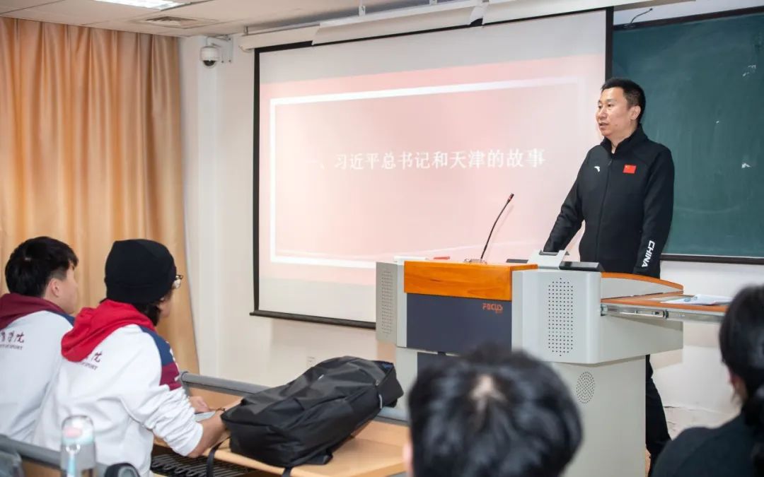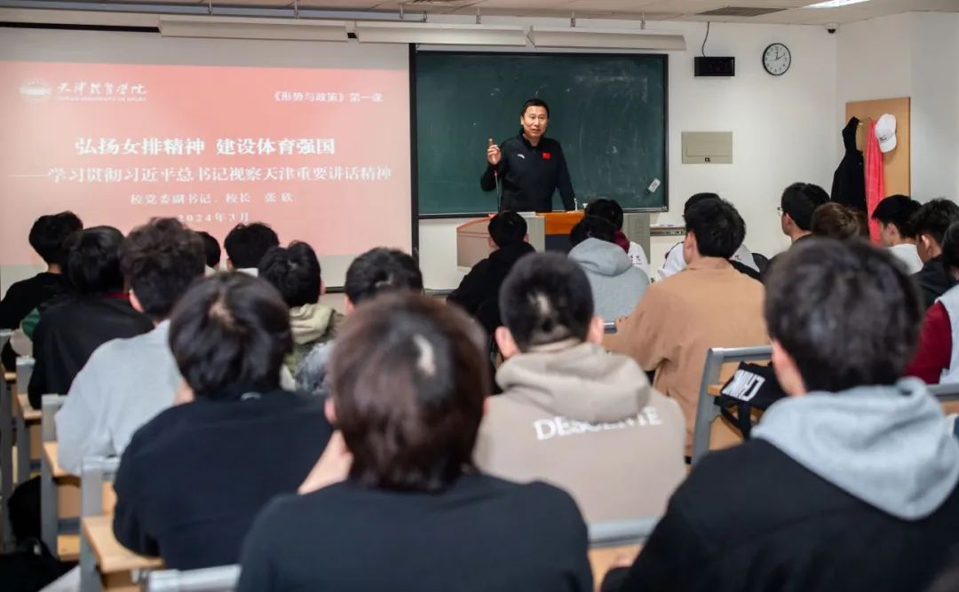 3月13日下午,党委副书记、院长张欣为社会体育学院2023级本科生讲授题为“弘扬女排精神 建设体育强国——学习贯彻习近平总书记视察天津重要讲话精神”的形势与政策第一课。