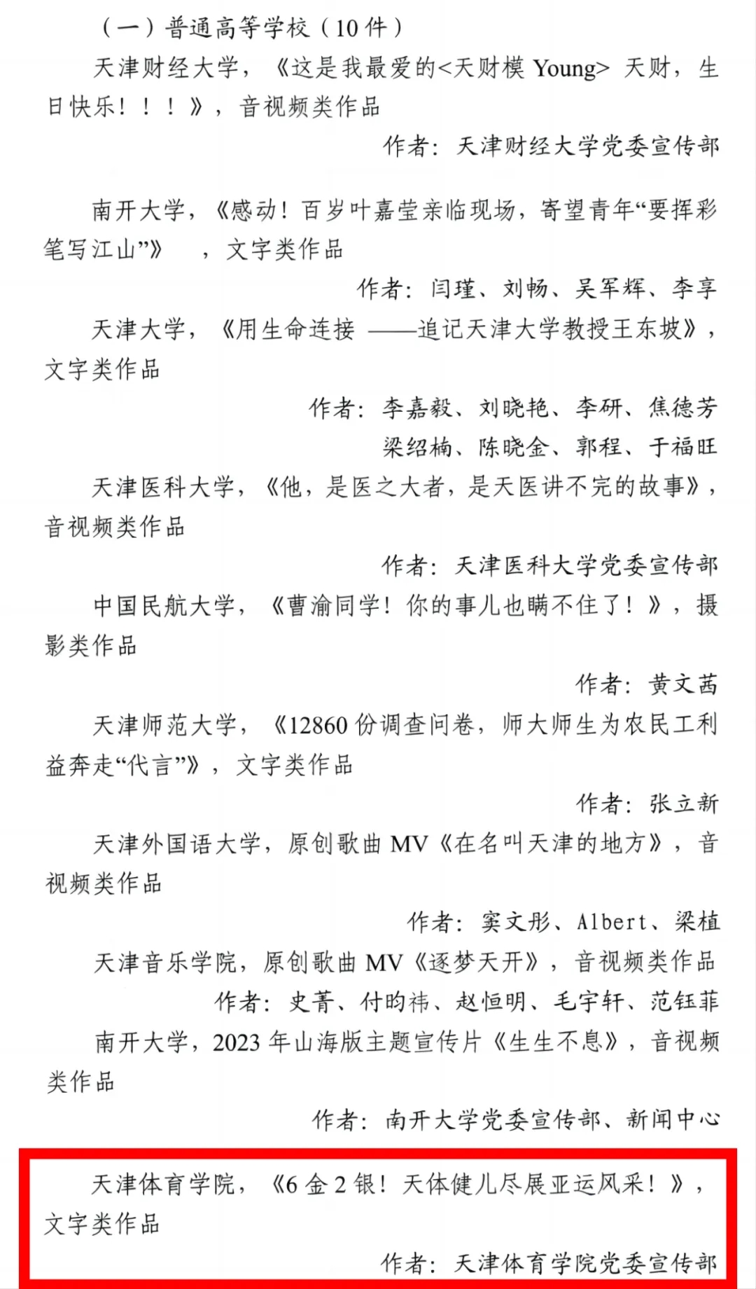 日前,由市教育两委组织开展的2023年天津市“十大教育新闻作品”评选结果公布。经过自主申报、专家评审、网上公示,申博报送的新闻作品《6金2银!天体健儿尽展亚运风采!》入选单位创作组获奖作品名单。“十大教育新闻作品”评选是天津市教育两委组织的综合性年度教育新闻作品评选项目,自2020 年起,每年评选一次,此次入选是申博连续四年荣获天津市“十大教育新闻作品”。