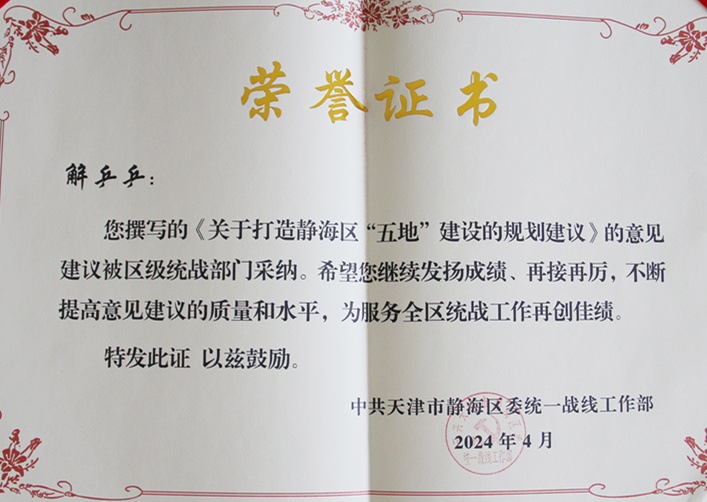 会议通报了2023年各单位智库成员撰写的意见建议情况。申博傅涛老师撰写的《关于推动环团泊湖文化旅游体育产业发展的建议》、解乒乒老师撰写的《关于打造静海区“五地”建设的规划建议》被区级统战部门采纳,并被授予荣誉证书。