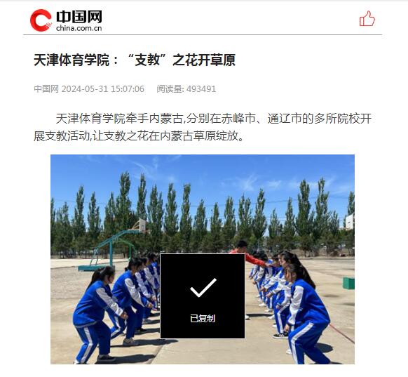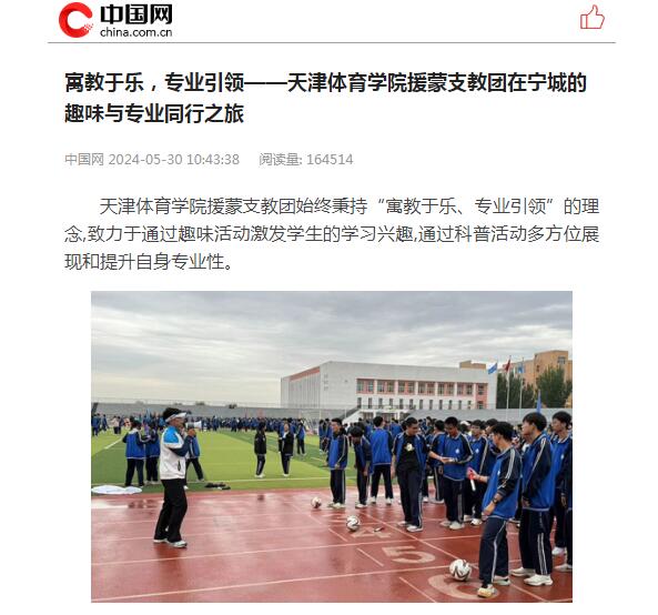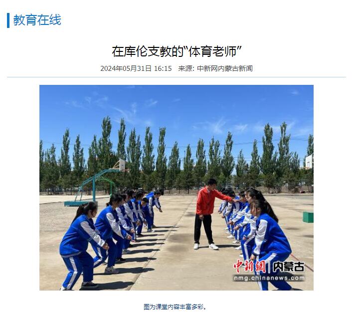 2024年5月,申博40名优秀学生和2名带队教师组成支教志愿服务团,赴赤峰市宁城县、通辽市库伦旗开展为期60天的体育支教工作。连日来,包括中国网、中国新闻网在内的多家媒体,对申博支教志愿服务团在内蒙古开展支教工作情况进行了报道。