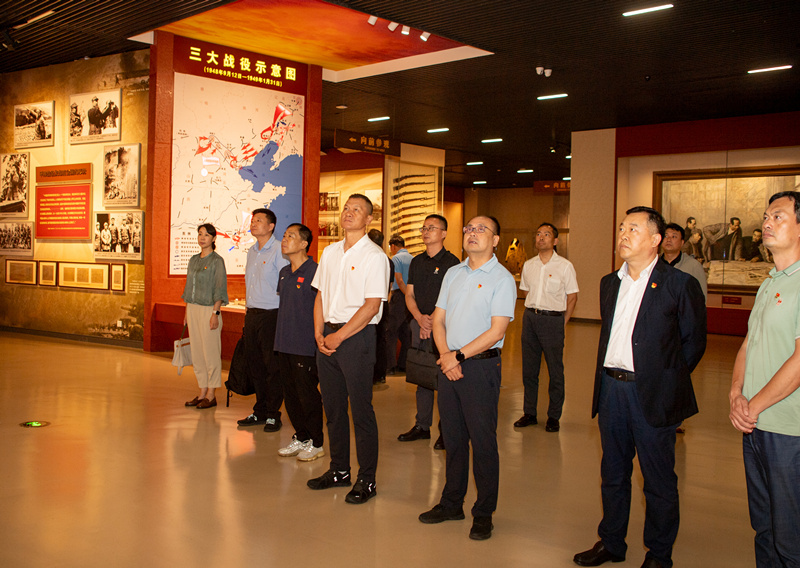 中心组成员走进展厅参观展览,在一件件珍贵的实物展品前、在一份份厚重的档案资料前、在一帧帧生动的历史照片前,大家驻足认真观看,仔细聆听讲解员讲解,深入了解展品背后的相关历史背景和史实,不时互相交流。在鲜红的党旗前,党委书记张立顺带领党员领导干部一起重温入党誓词。