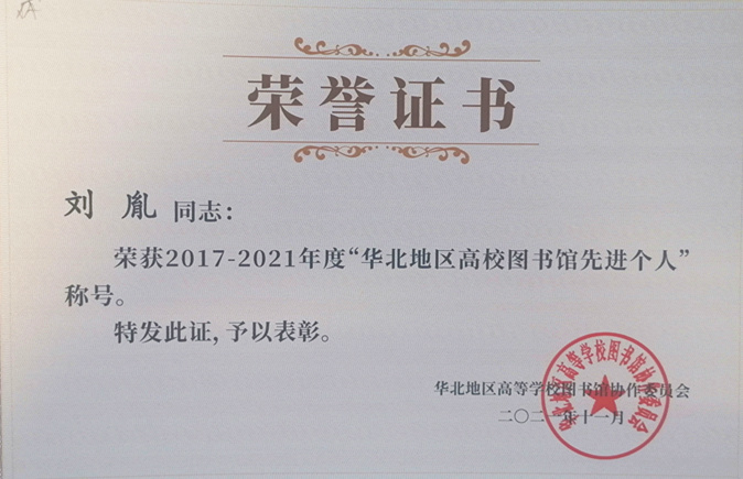 会上,华北地区高等学校图书馆协作委员会对在高校图书馆工作中做出突出贡献的个人和集体进行了表彰,申博图书馆荣获2017-2021年度“华北地区高等学校图书资料先进集体”荣誉称号,刘胤荣获“华北地区高等学校图书馆先进个人”荣誉称号。