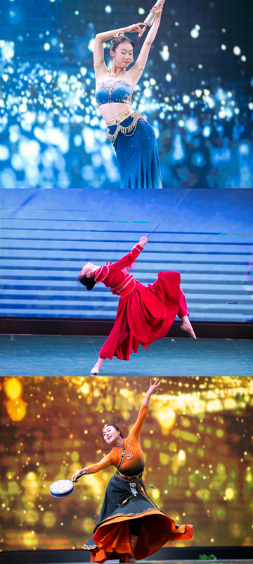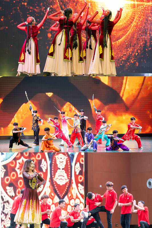 展演活动围绕“芽苞初放、新枝吐蕾”“榴花似火、鲜艳夺目”“千房同蒂、千子如一”三个主题单元徐徐展开,以石榴抽枝、开花、结果的主题脉络展现申博民族团结进步工作的进展与成效。申博“红石榴”铸牢中华民族共同体意识宣讲团成员姜宏浩、艾日帕尼·艾尼瓦尔与张奕锦同学,结合自身的成长与求学经历,讲述自己作为一颗“石榴籽”在中华民族大家庭这个“红石榴”中的所见所闻所感,展现了各族儿女共同团结奋斗、共同繁荣发展,为强国建设、民族复兴贡献力量的决心。舞蹈《艺舞传承》翩如兰苕翠,宛如游龙举,生动展现了民族舞蹈的继承与发展,《掀起你的盖头来》淋漓尽致地展现了新疆少数民族淳朴热情的精神风貌,武术表演《龙腾虎跃》,剑舞风云动、拳出天地惊,体现了中华民族崇德尚武的文化内核。