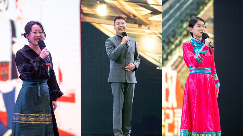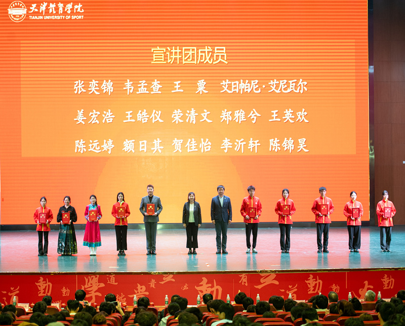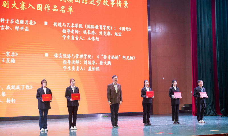在“红石榴”铸牢中华民族共同体意识宣讲团成立仪式上,党委常委、副院长赵霞为宣讲团授旗,党委常委、党委统战部部长依惠琴为宣讲团指导教师颁发聘书,党委学生工作部部长田向国、校团委书记单小红为宣讲团成员颁发聘书。此外,党委常委、党委组织部部长罗秀伟为民族团结进步故事情景剧大赛入围团队代表颁奖。“红石榴”铸牢中华民族共同体意识宣讲团旨在以铸牢中华民族共同体意识为主线,立足青年学生视角,讲述民族团结故事,宣传民族政策,促进各族师生交往交流交融。展演活动暨宣讲团成立仪式在舞蹈《华夏欢歌》中落下帷幕。