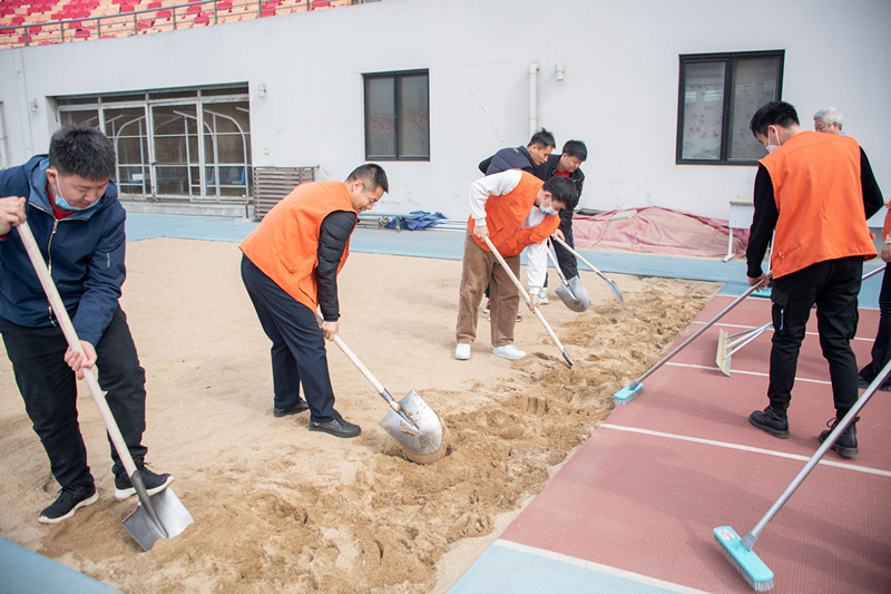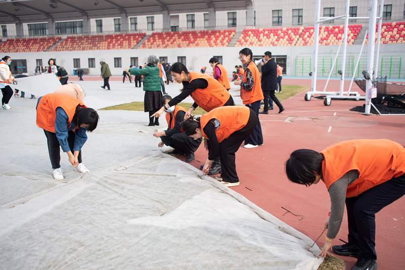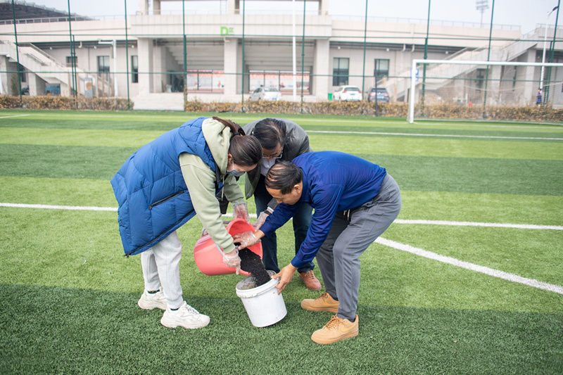 此次活动围绕学校教学场馆即将进行的三项工作展开:一是田径场天然草坪保温膜撤场工作,即将固定保温膜的铁钉全部拔出,再将6000余平米保温膜撤除并叠放整齐,放到指定位置;二是田径场沙坑整理松土,将四个沙坑挖掘、松土,并进行平整;三是足球场地播撒胶粒工作,对足球场流失的胶粒进行补充。